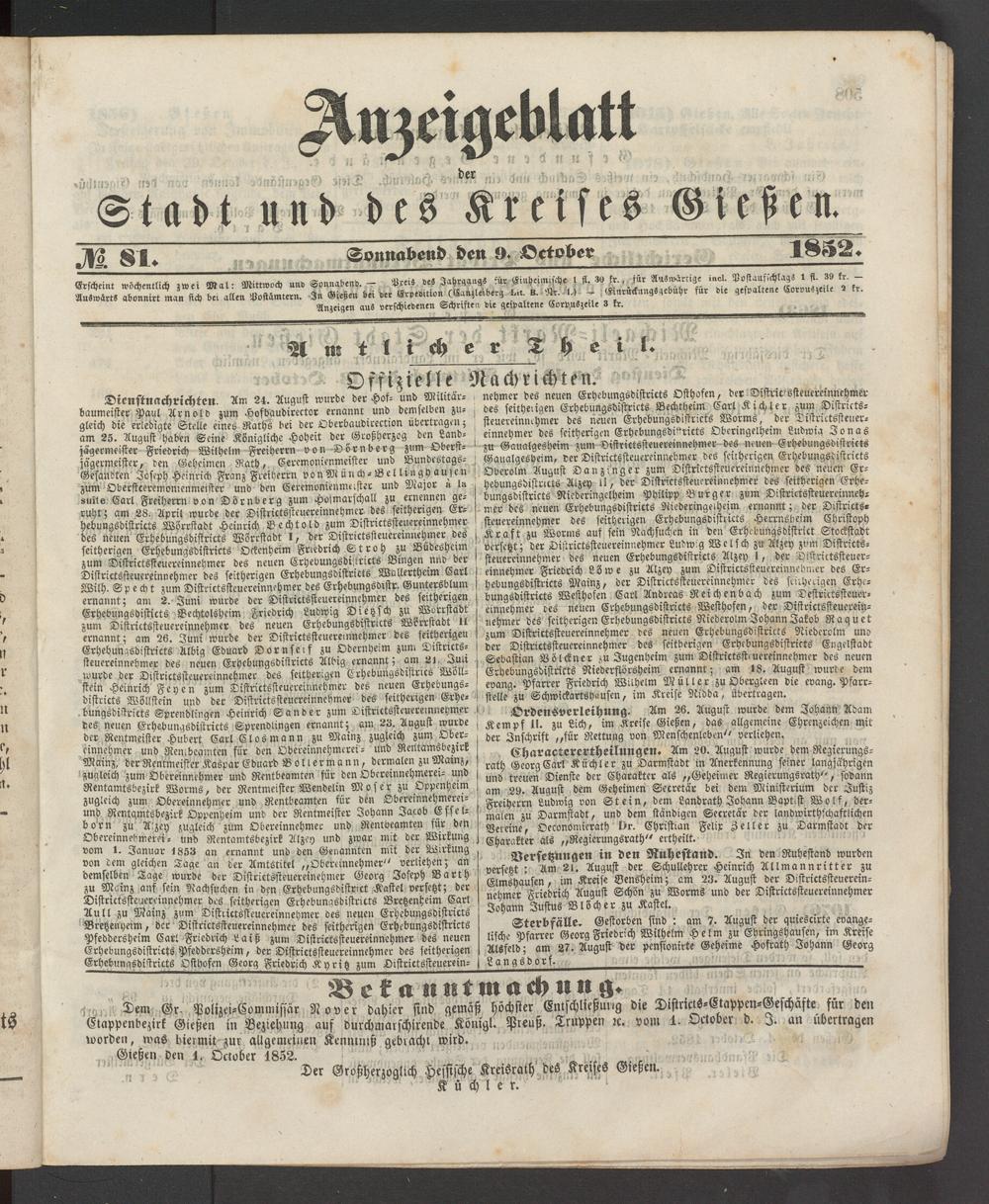 Anzeigeblatt für die Provinzialhauptstadt Gießen. 1840-1867