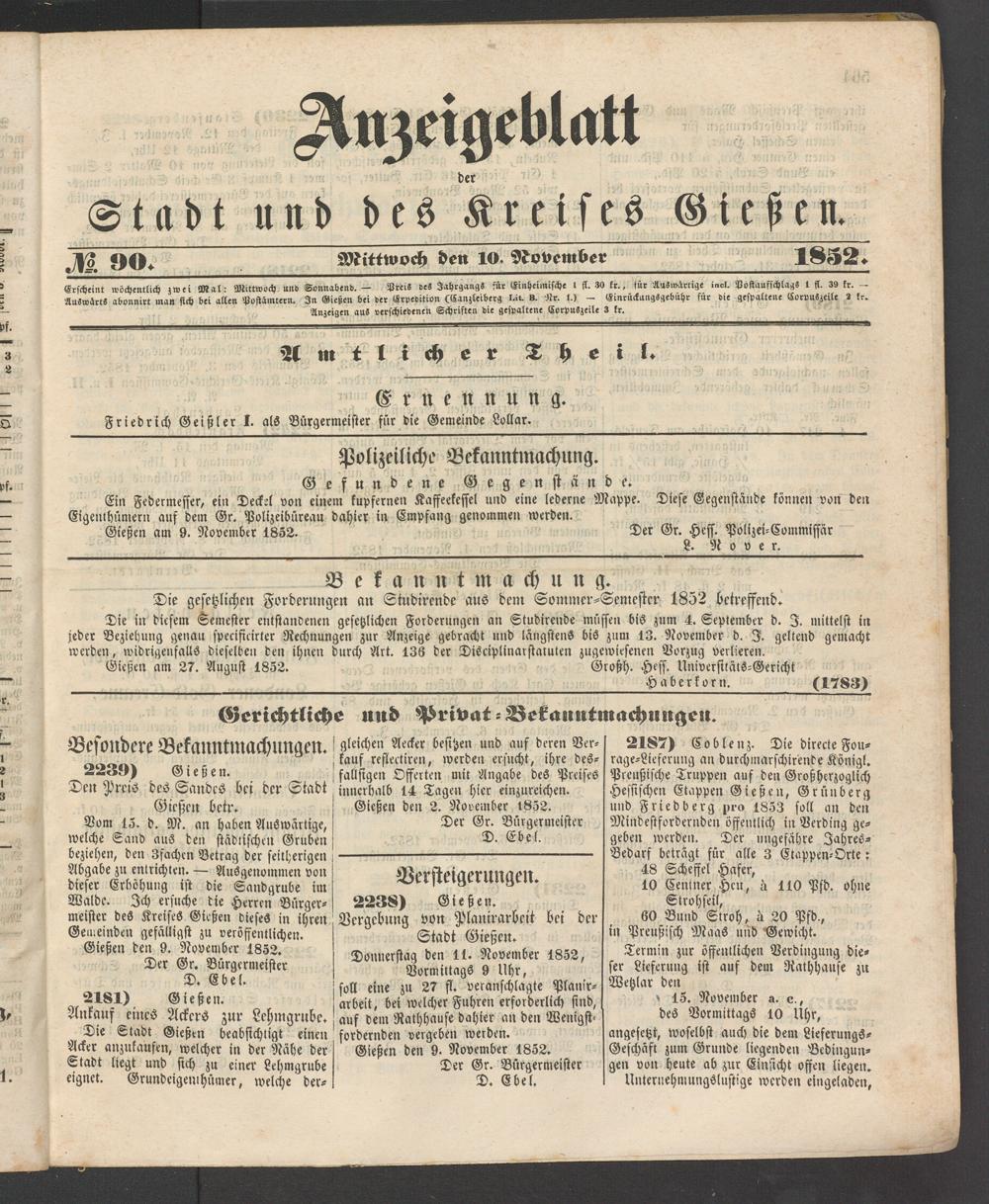 Anzeigeblatt für die Provinzialhauptstadt Gießen. 1840-1867