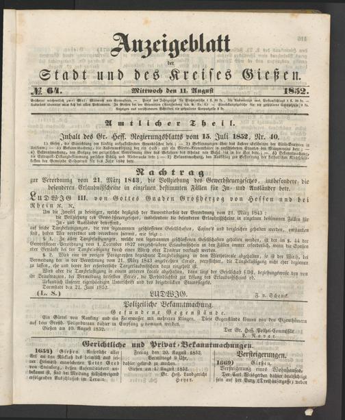 Anzeigeblatt für die Provinzialhauptstadt Gießen. 1840-1867