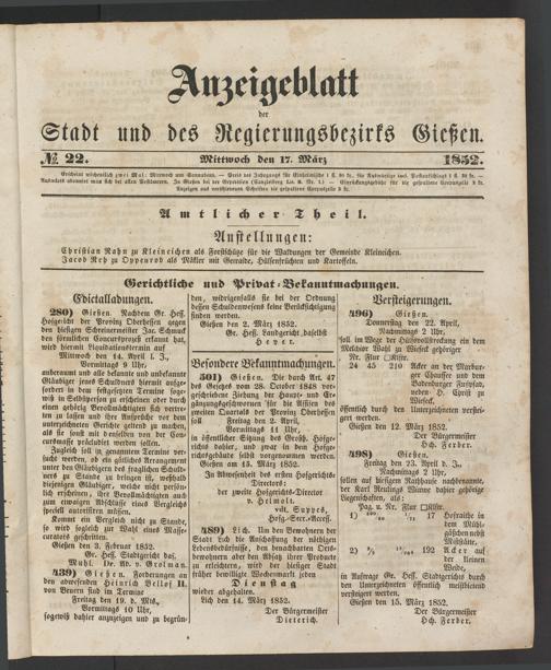 Anzeigeblatt für die Provinzialhauptstadt Gießen. 1840-1867