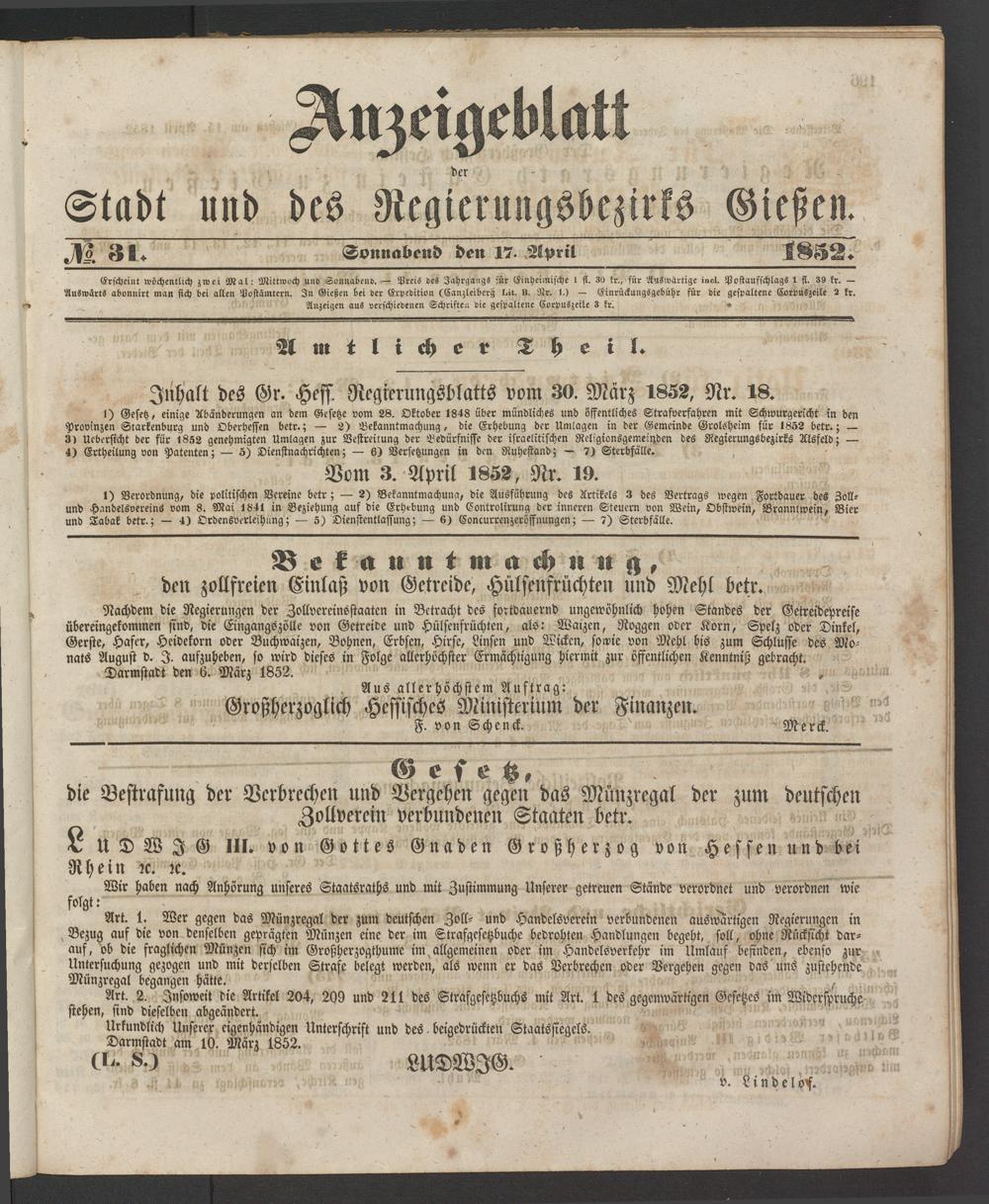 Anzeigeblatt für die Provinzialhauptstadt Gießen. 1840-1867