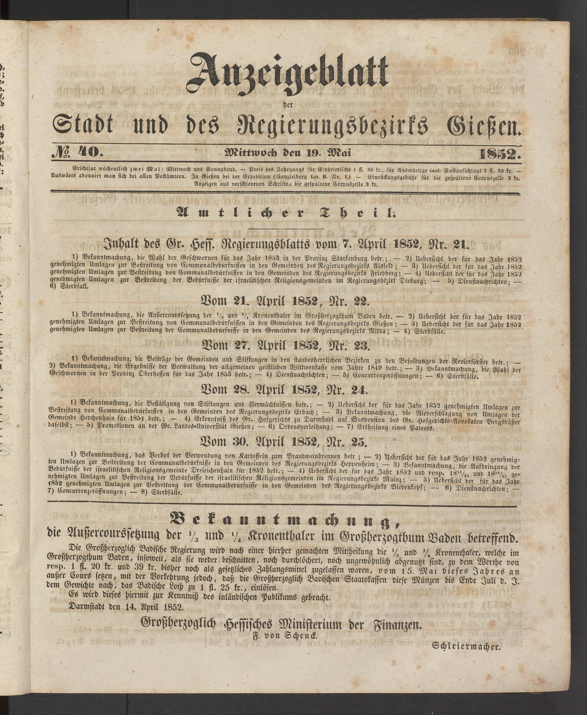 Anzeigeblatt für die Provinzialhauptstadt Gießen. 1840-1867