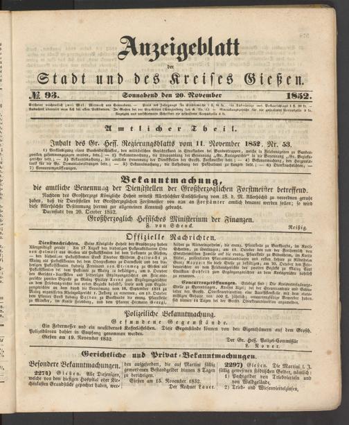 Anzeigeblatt für die Provinzialhauptstadt Gießen. 1840-1867