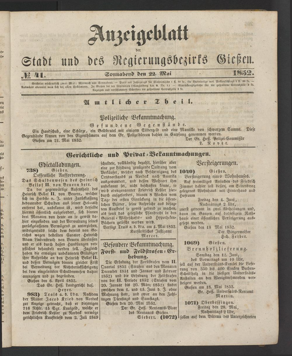 Anzeigeblatt für die Provinzialhauptstadt Gießen. 1840-1867