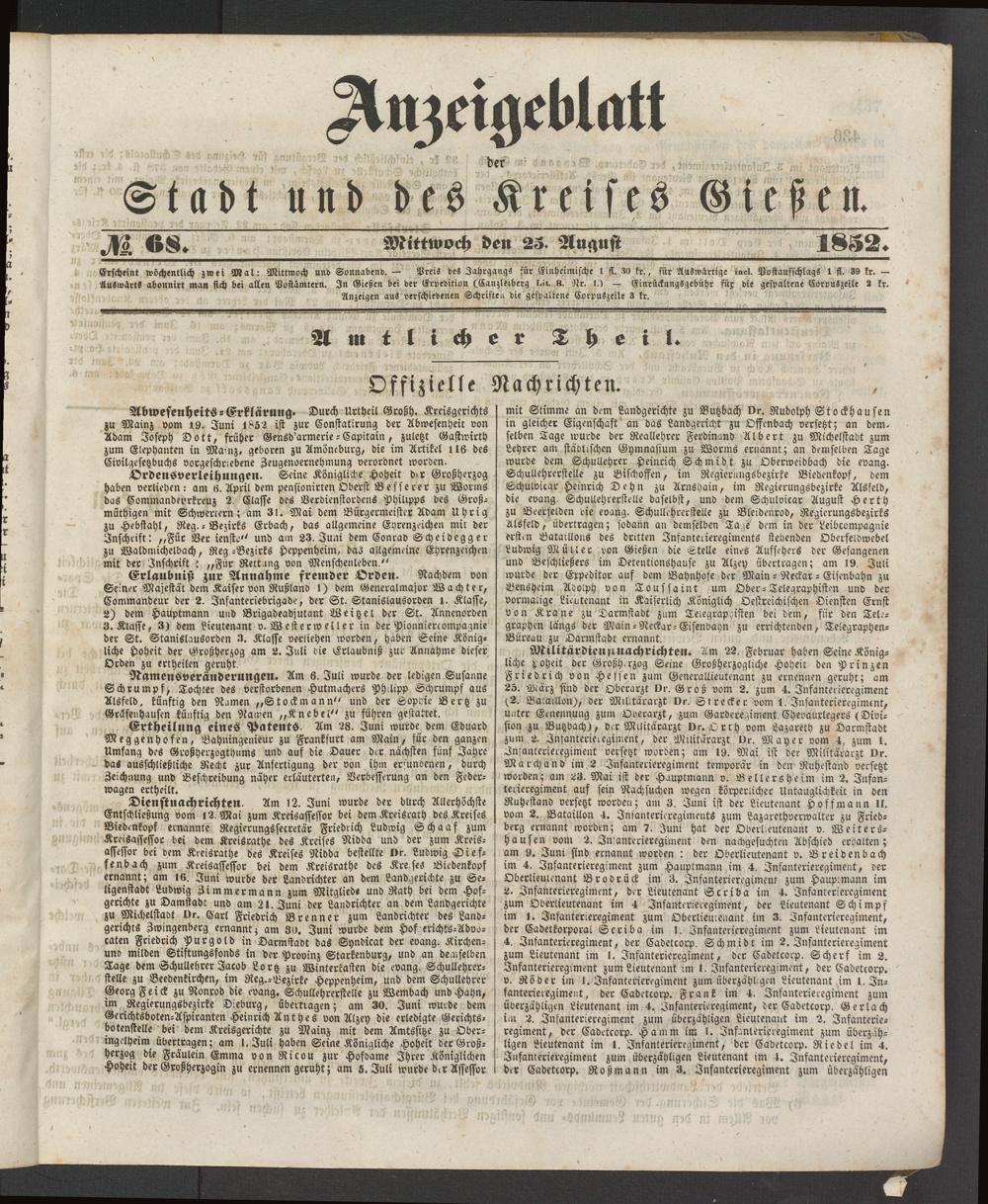 Anzeigeblatt für die Provinzialhauptstadt Gießen. 1840-1867