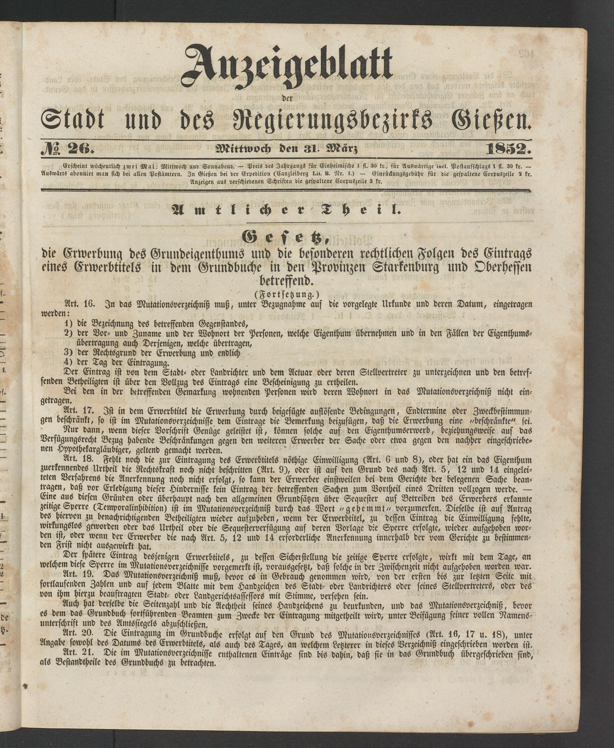 Anzeigeblatt für die Provinzialhauptstadt Gießen. 1840-1867