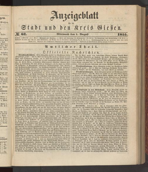 Anzeigeblatt für die Provinzialhauptstadt Gießen. 1840-1867