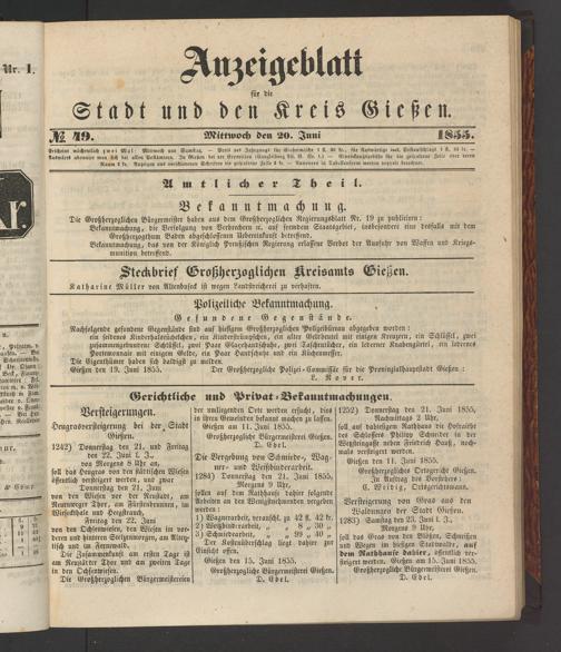 Anzeigeblatt für die Provinzialhauptstadt Gießen. 1840-1867