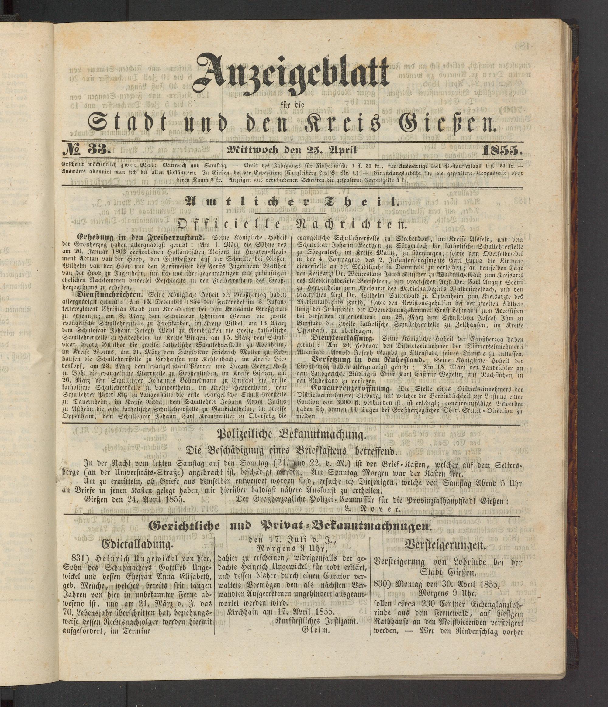 Anzeigeblatt für die Provinzialhauptstadt Gießen. 1840-1867