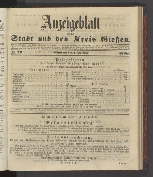 Anzeigeblatt für die Provinzialhauptstadt Gießen. 1840-1867