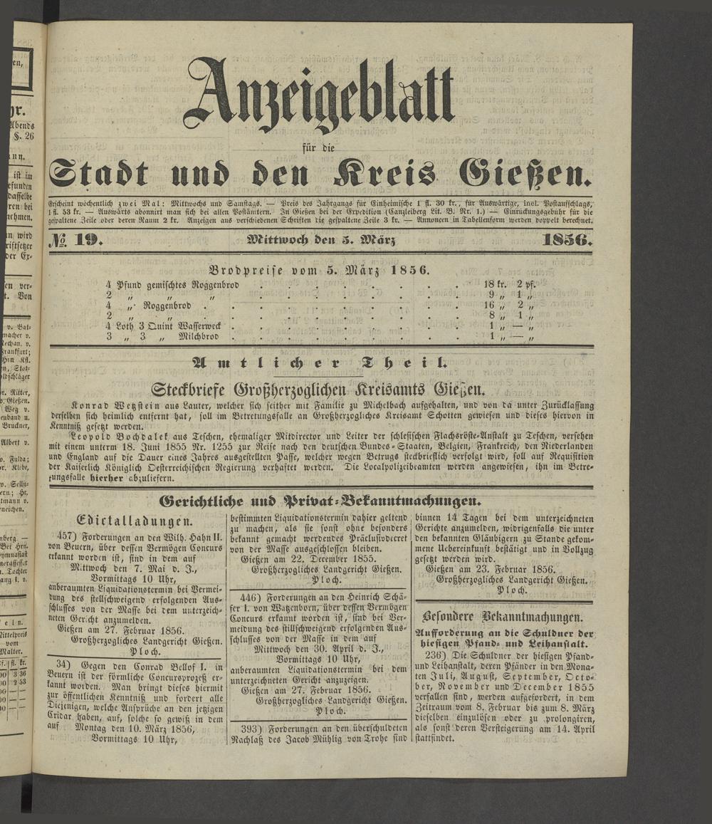 Anzeigeblatt für die Provinzialhauptstadt Gießen. 1840-1867