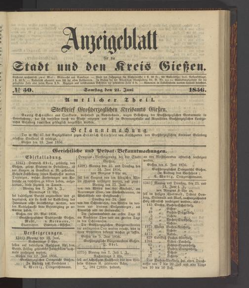 Anzeigeblatt für die Provinzialhauptstadt Gießen. 1840-1867