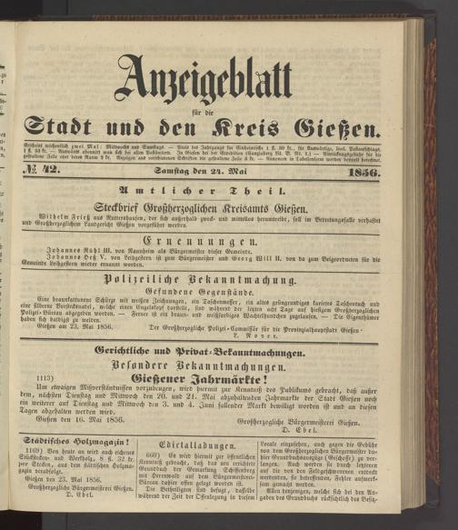 Anzeigeblatt für die Provinzialhauptstadt Gießen. 1840-1867