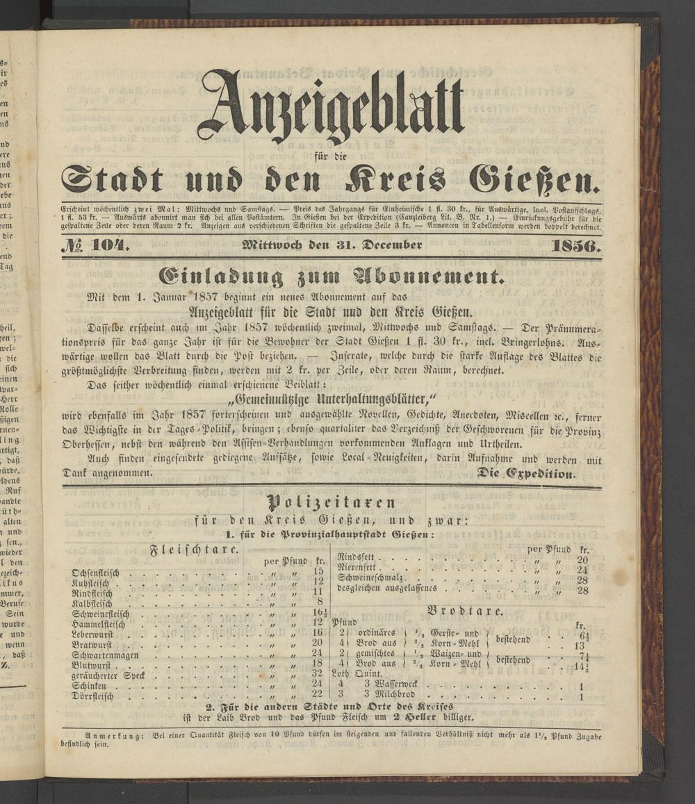 Anzeigeblatt für die Provinzialhauptstadt Gießen. 1840-1867