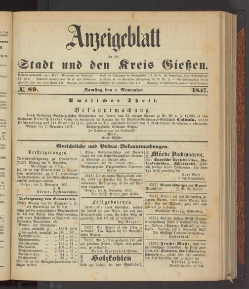 Anzeigeblatt für die Provinzialhauptstadt Gießen. 1840-1867