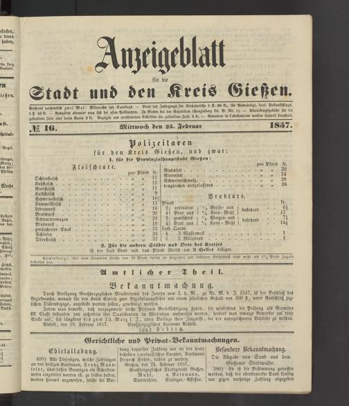 Anzeigeblatt für die Provinzialhauptstadt Gießen. 1840-1867