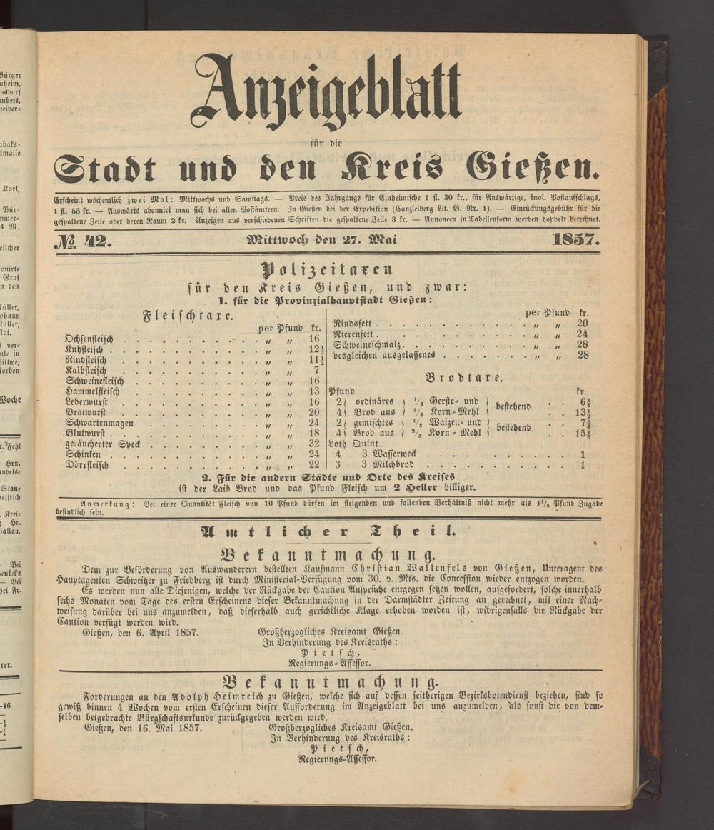 Anzeigeblatt für die Provinzialhauptstadt Gießen. 1840-1867