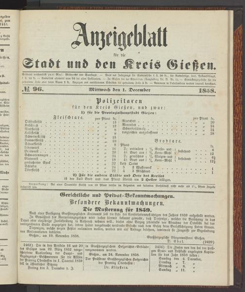 Anzeigeblatt für die Provinzialhauptstadt Gießen. 1840-1867