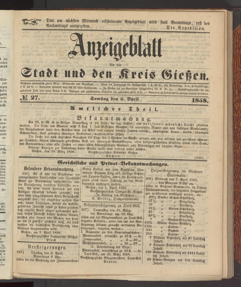 Anzeigeblatt für die Provinzialhauptstadt Gießen. 1840-1867