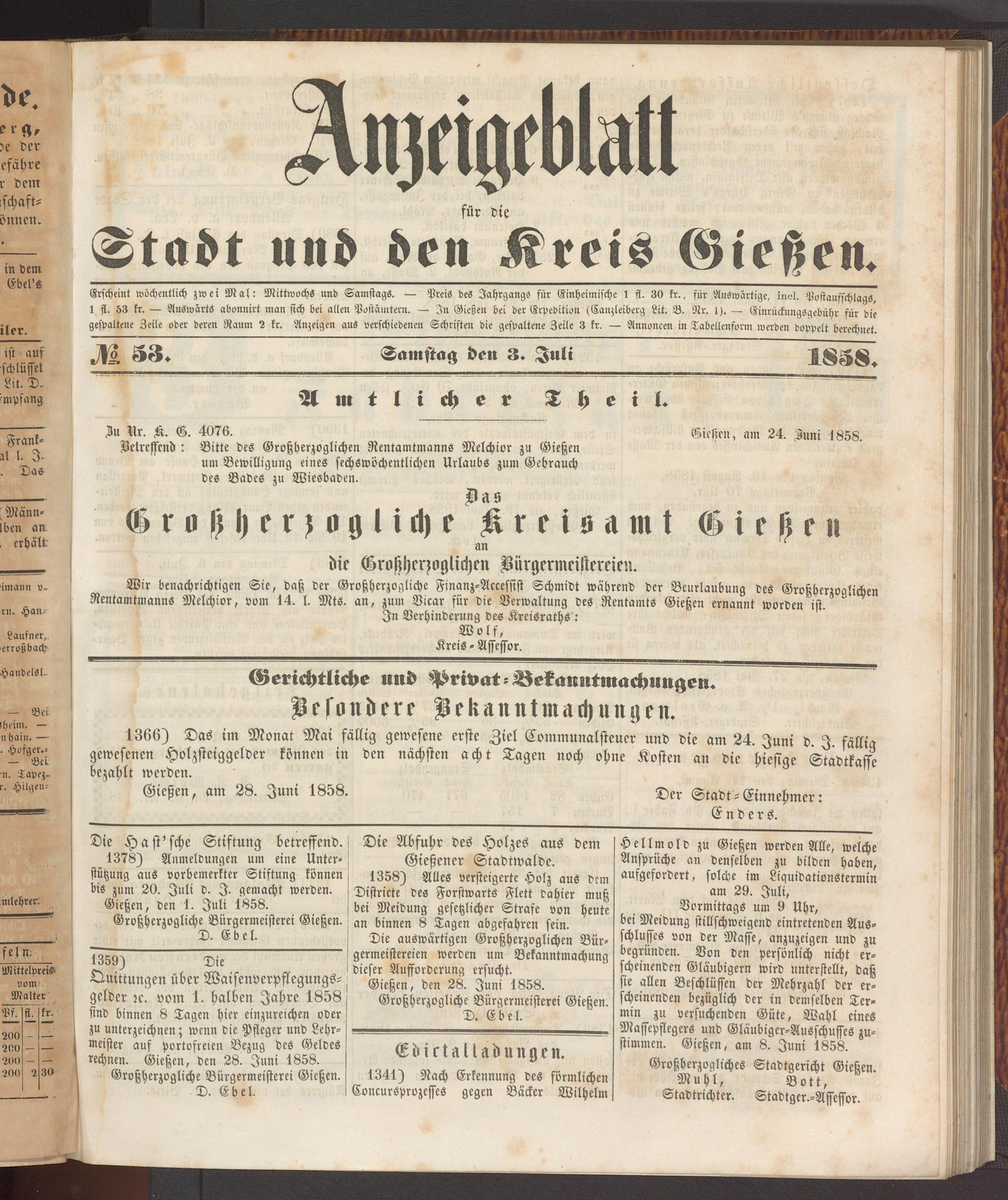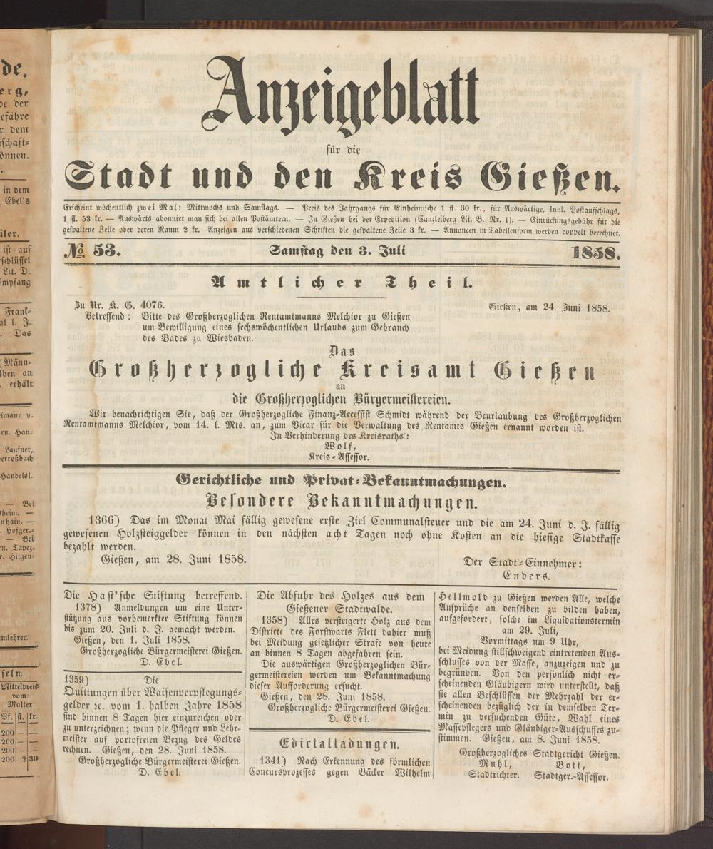 Anzeigeblatt für die Provinzialhauptstadt Gießen. 1840-1867