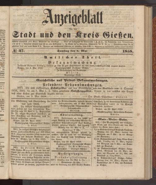 Anzeigeblatt für die Provinzialhauptstadt Gießen. 1840-1867