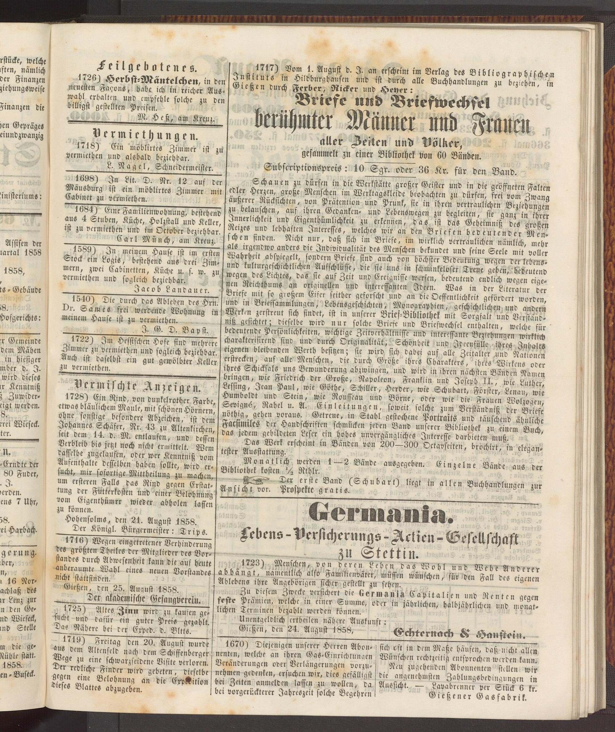 Anzeigeblatt für die Provinzialhauptstadt Gießen. 1840-1867