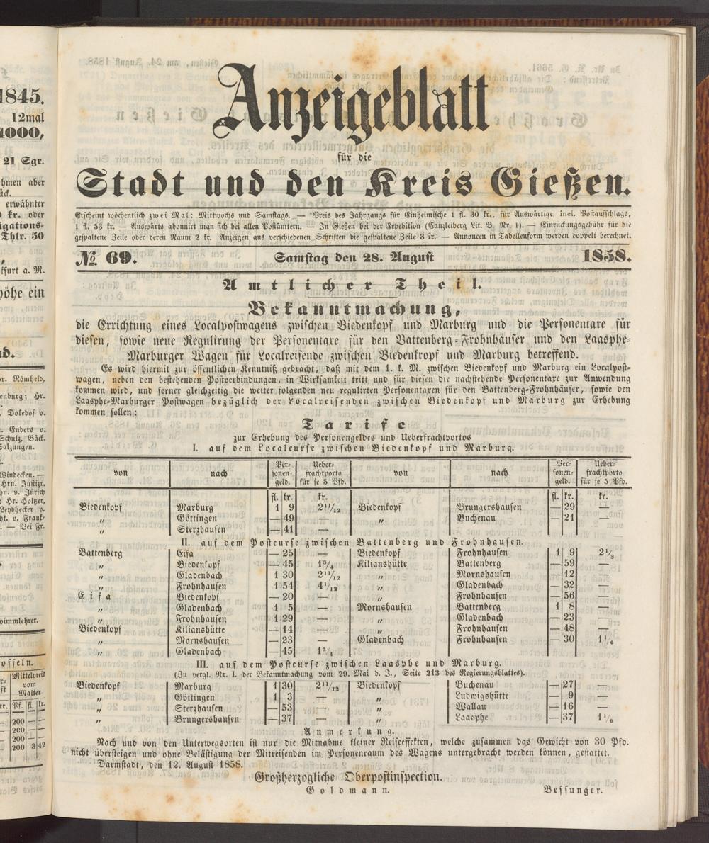 Anzeigeblatt für die Provinzialhauptstadt Gießen. 1840-1867
