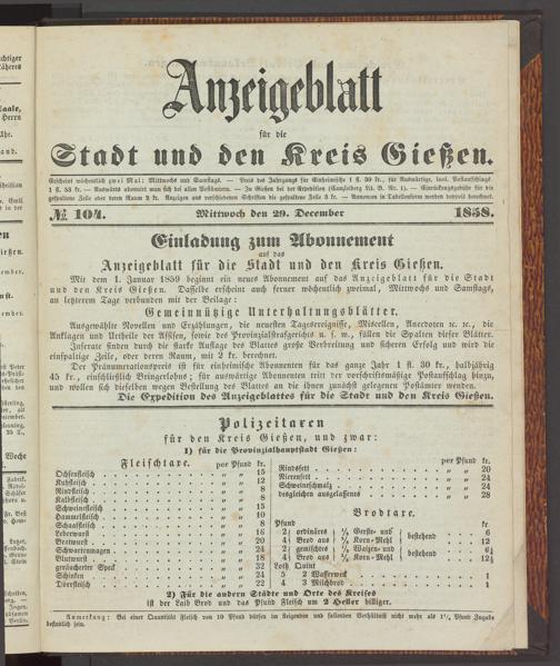 Anzeigeblatt für die Provinzialhauptstadt Gießen. 1840-1867