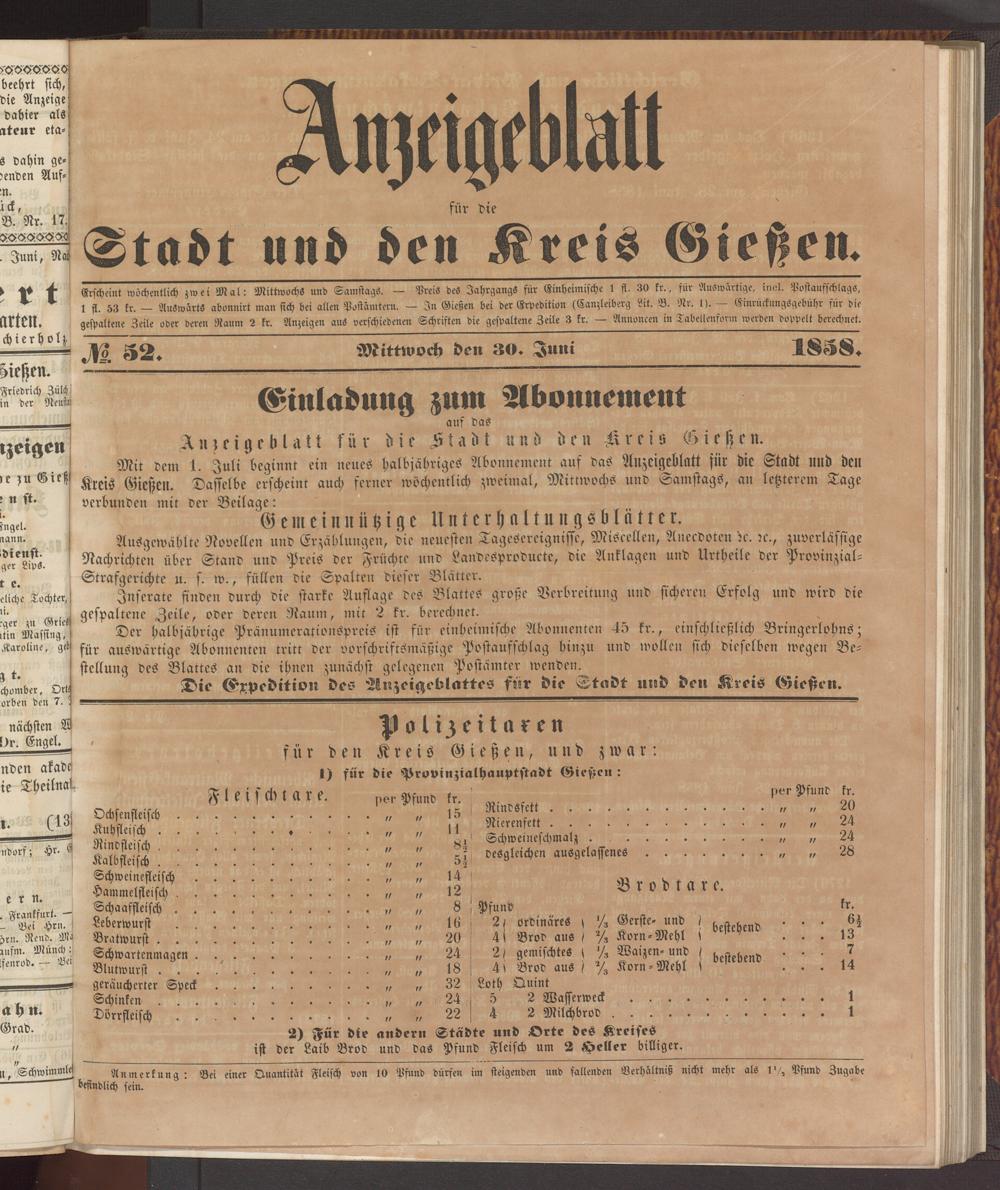 Anzeigeblatt für die Provinzialhauptstadt Gießen. 1840-1867