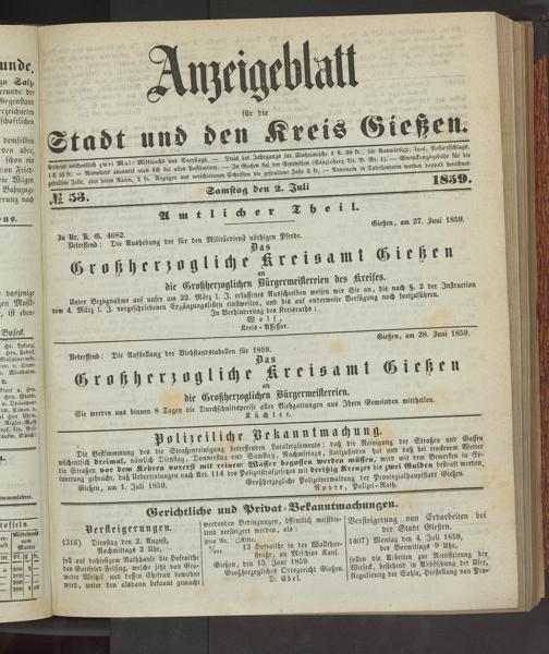 Anzeigeblatt für die Provinzialhauptstadt Gießen. 1840-1867