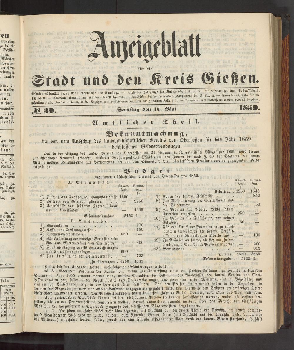 Anzeigeblatt für die Provinzialhauptstadt Gießen. 1840-1867