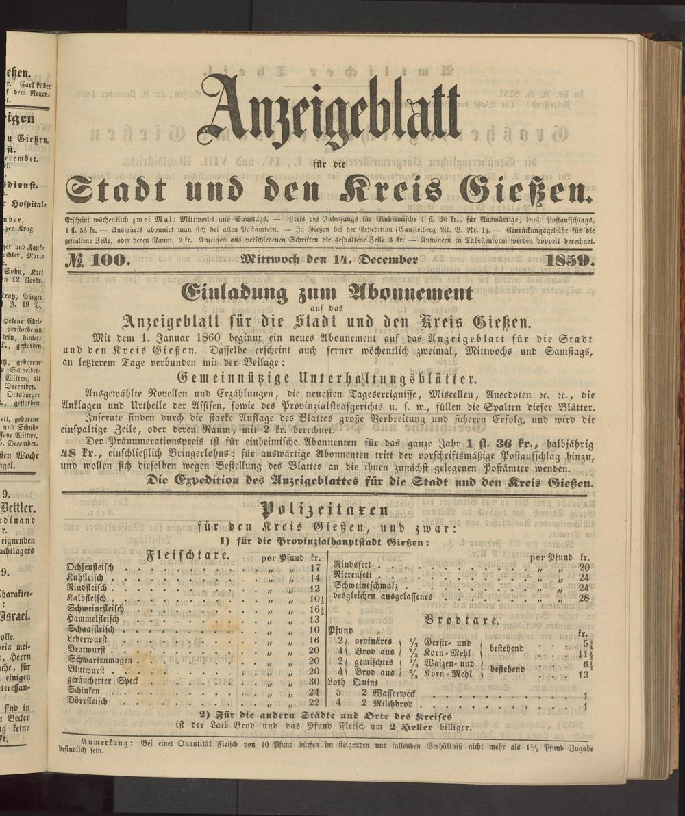 Anzeigeblatt für die Provinzialhauptstadt Gießen. 1840-1867