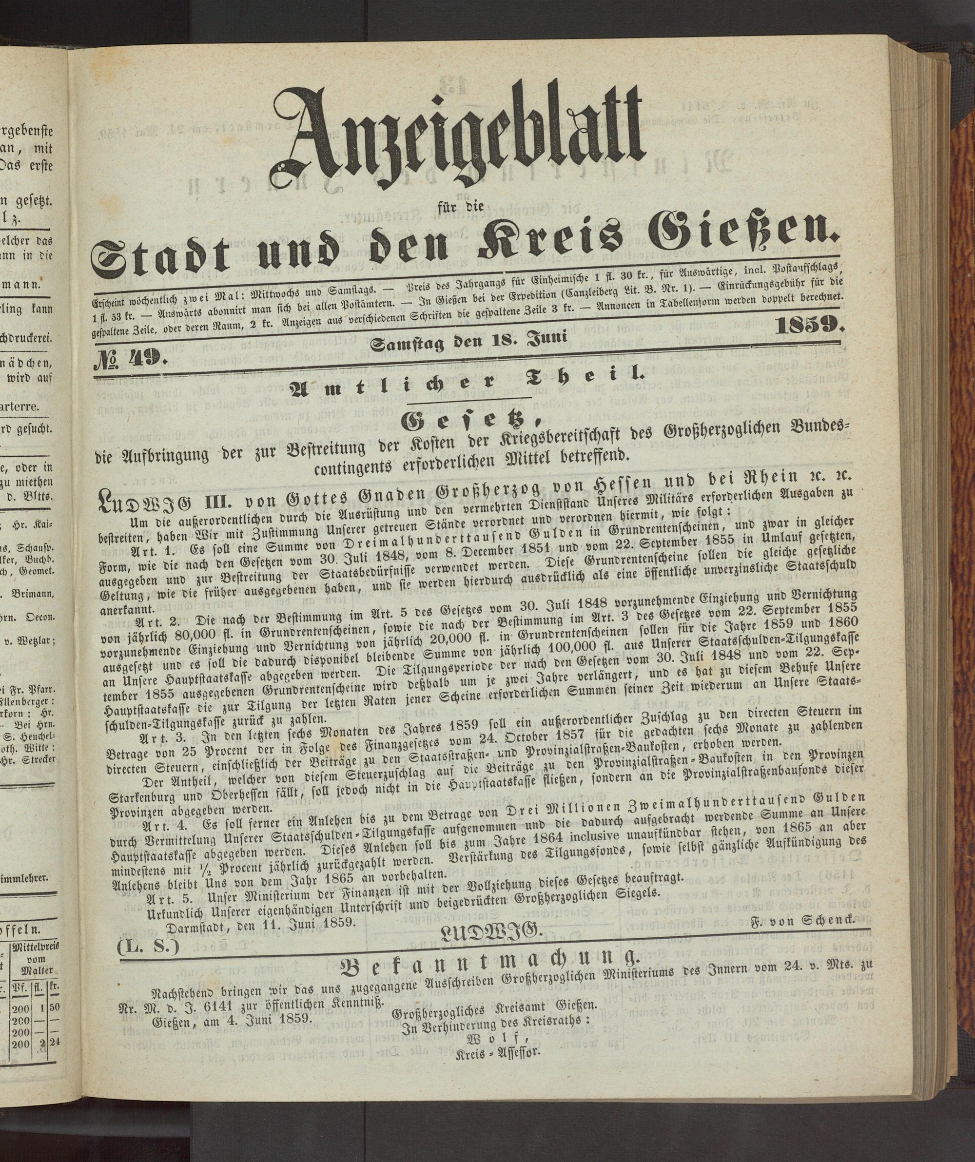 Anzeigeblatt für die Provinzialhauptstadt Gießen. 1840-1867