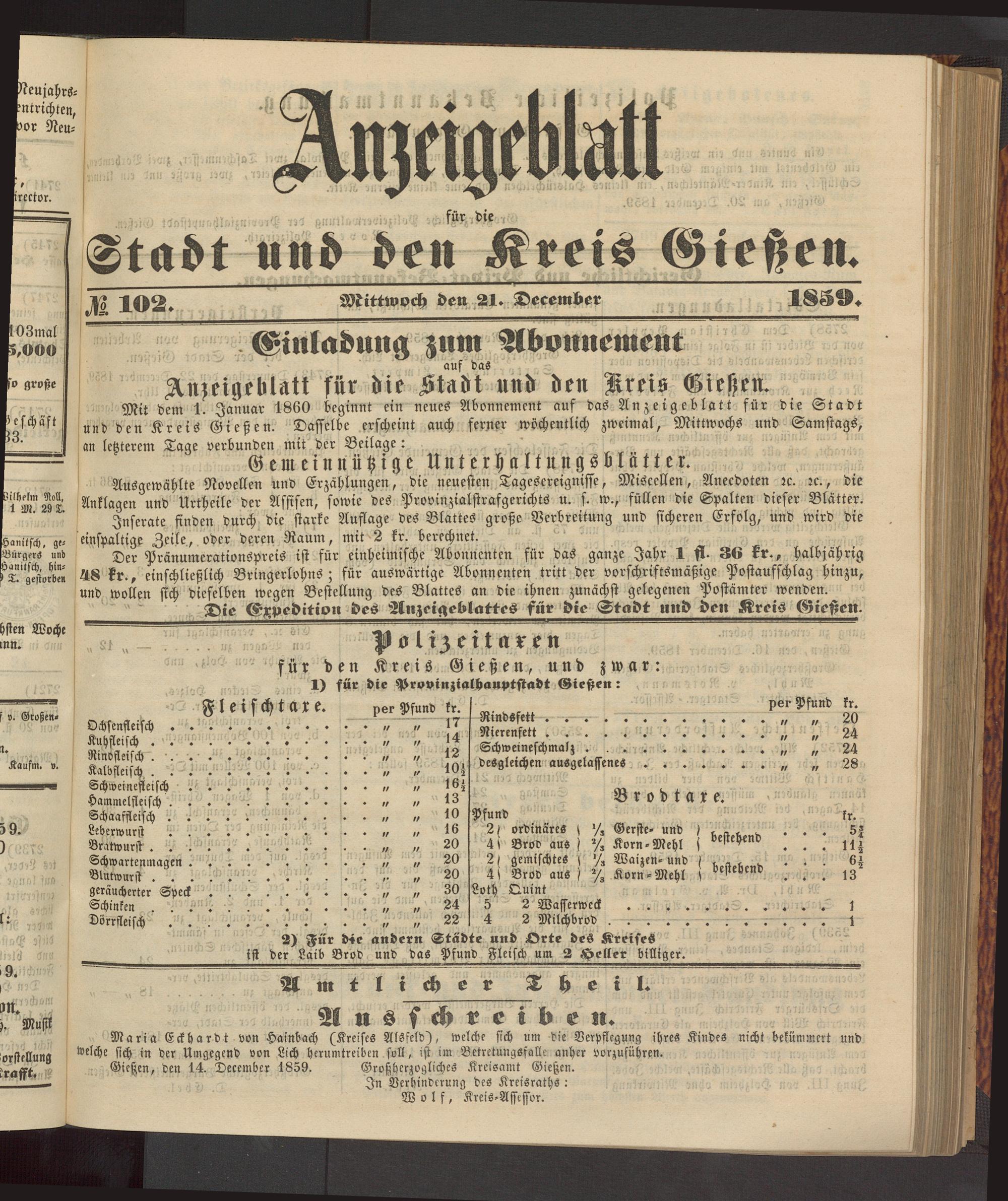Anzeigeblatt für die Provinzialhauptstadt Gießen. 1840-1867