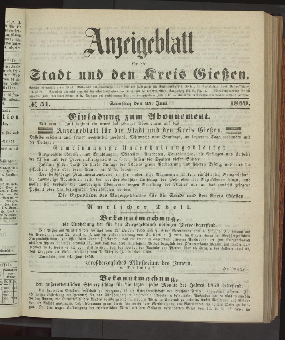 Anzeigeblatt für die Provinzialhauptstadt Gießen. 1840-1867