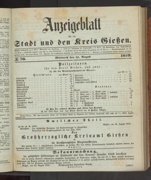 Anzeigeblatt für die Provinzialhauptstadt Gießen. 1840-1867