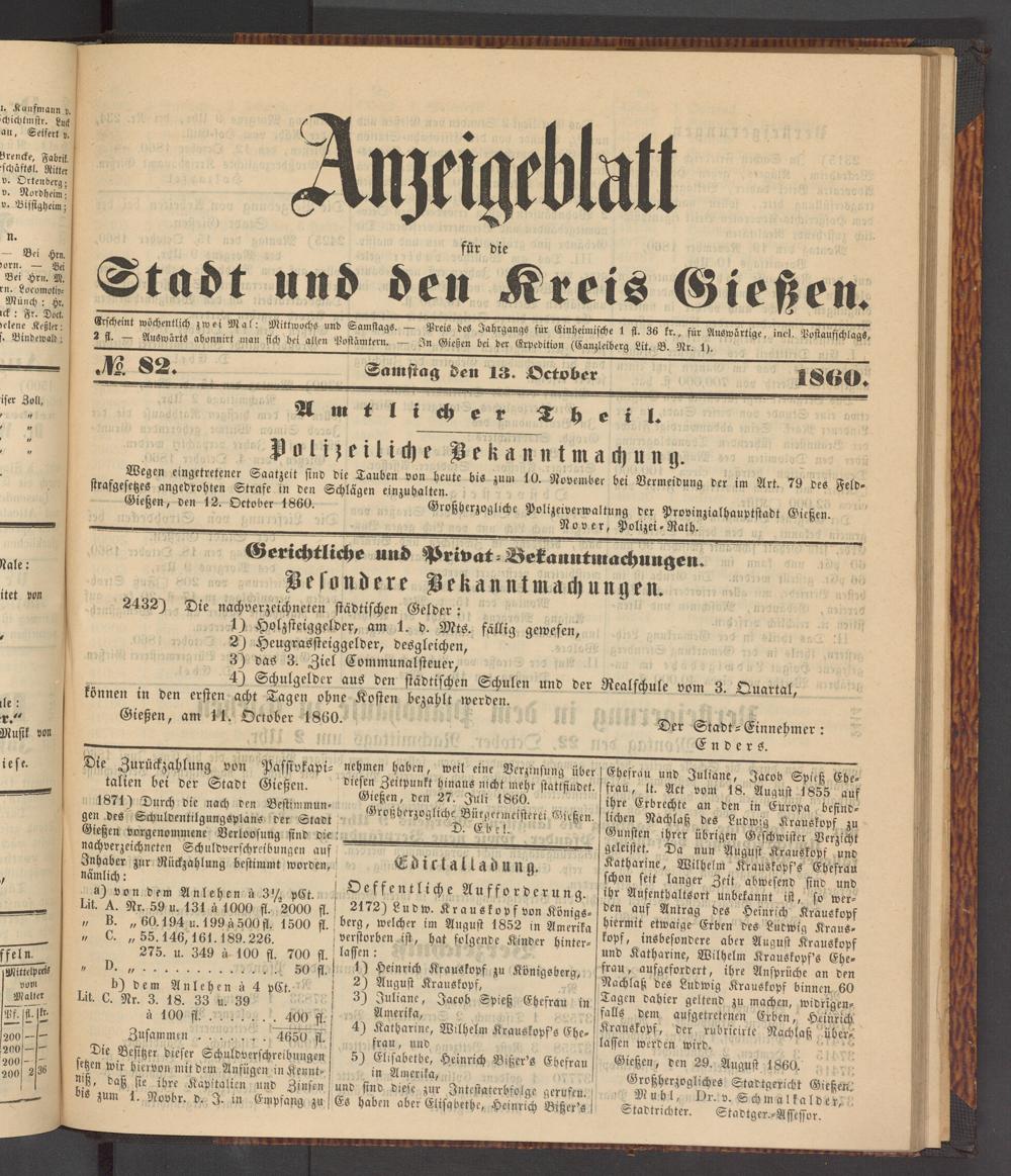 Anzeigeblatt für die Provinzialhauptstadt Gießen. 1840-1867