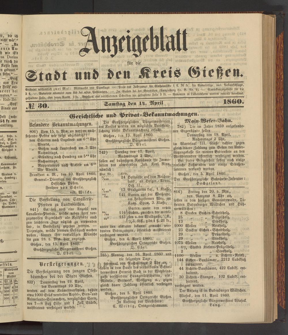 Anzeigeblatt für die Provinzialhauptstadt Gießen. 1840-1867