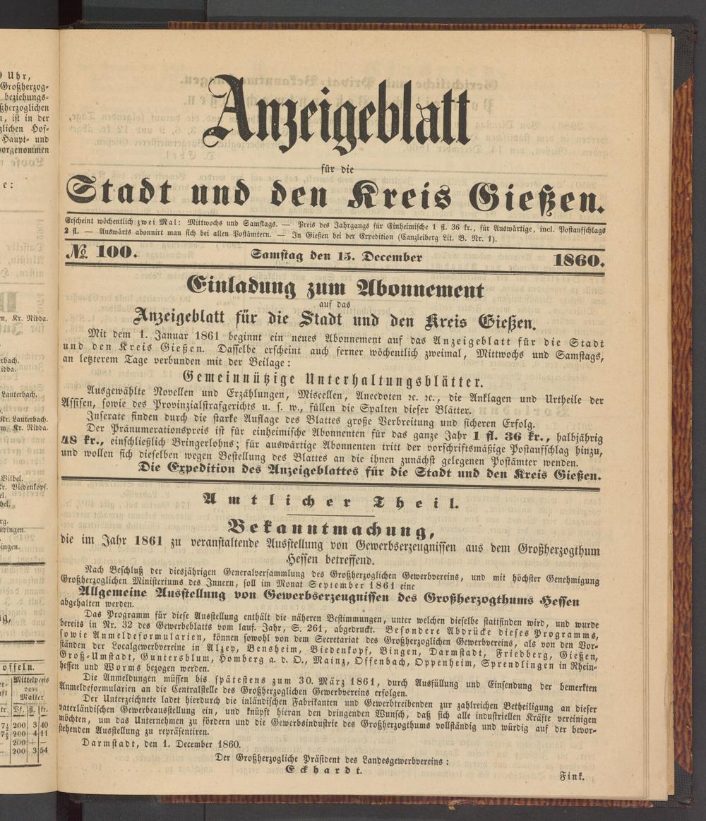Anzeigeblatt für die Provinzialhauptstadt Gießen. 1840-1867