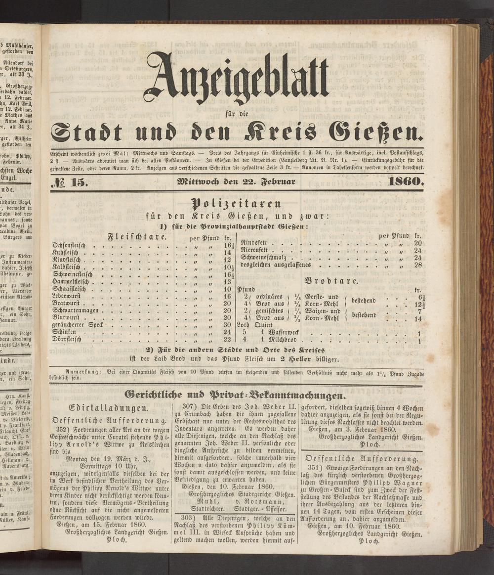 Anzeigeblatt für die Provinzialhauptstadt Gießen. 1840-1867