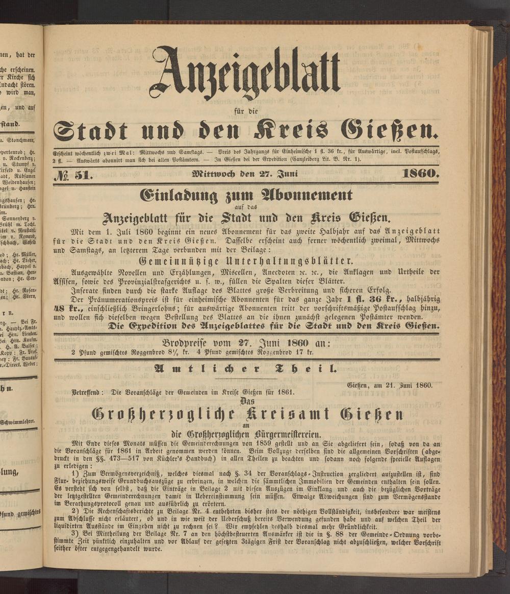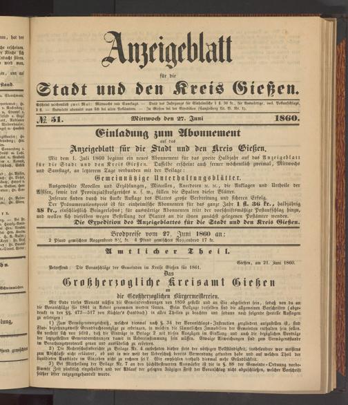 Anzeigeblatt für die Provinzialhauptstadt Gießen. 1840-1867