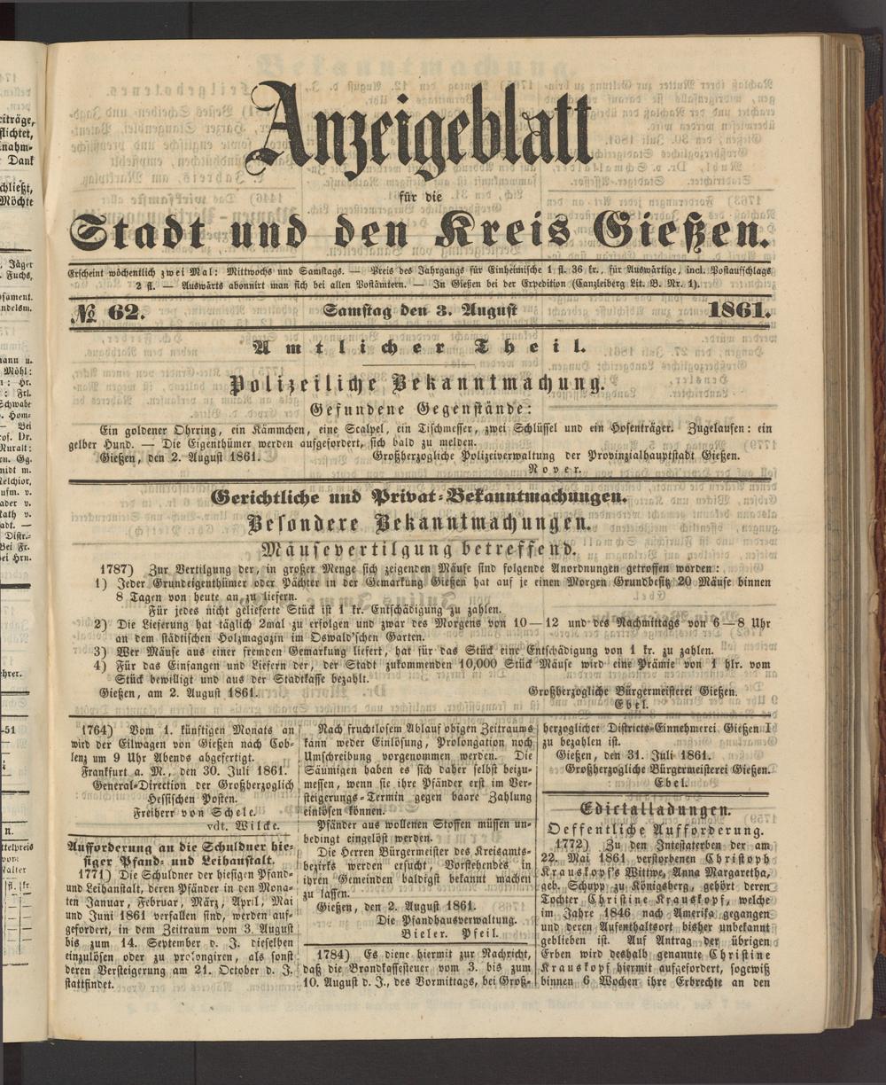 Anzeigeblatt für die Provinzialhauptstadt Gießen. 1840-1867
