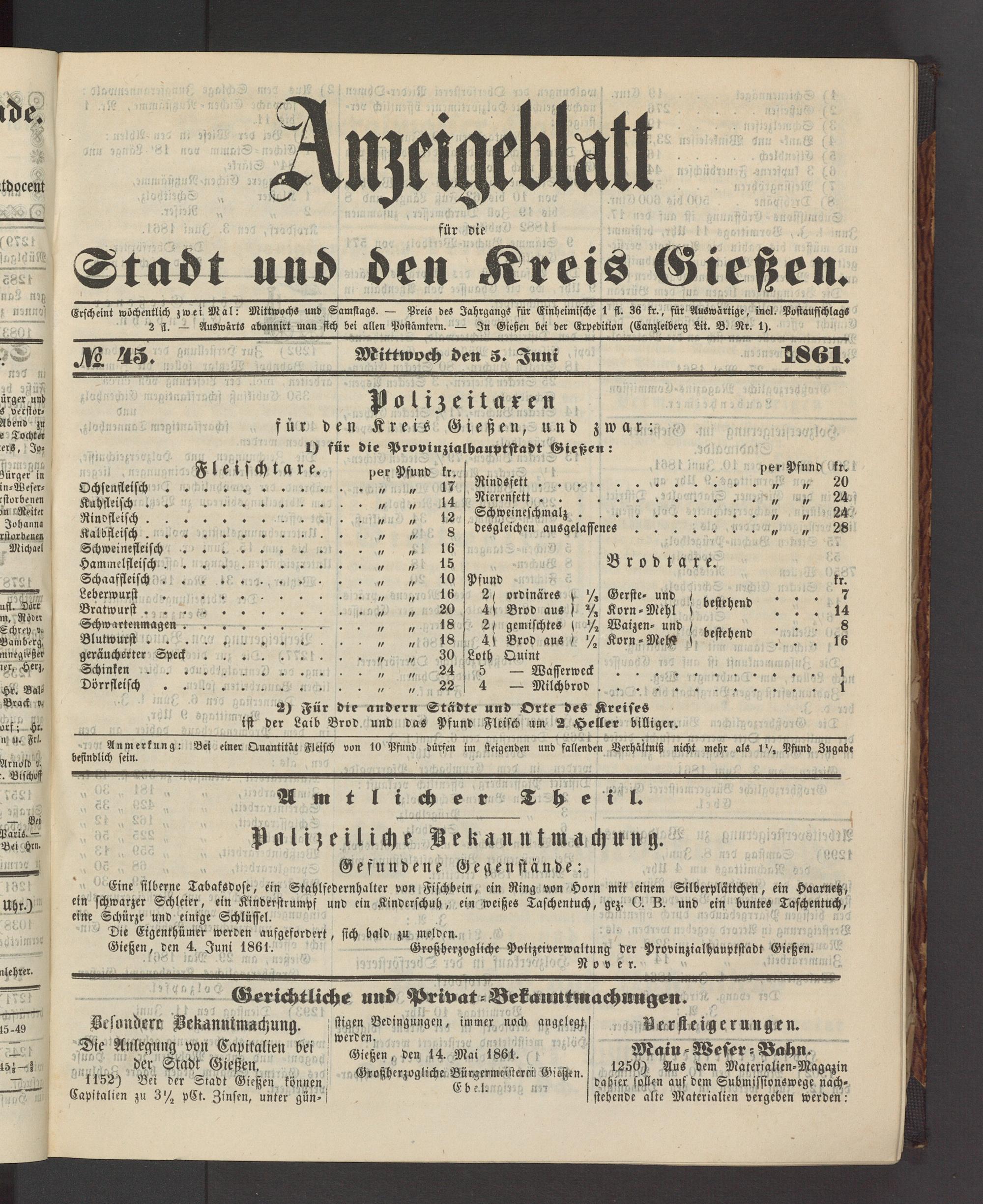 Anzeigeblatt für die Provinzialhauptstadt Gießen. 1840-1867