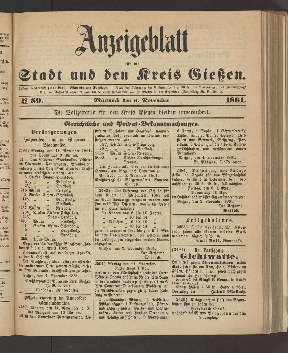Anzeigeblatt für die Provinzialhauptstadt Gießen. 1840-1867