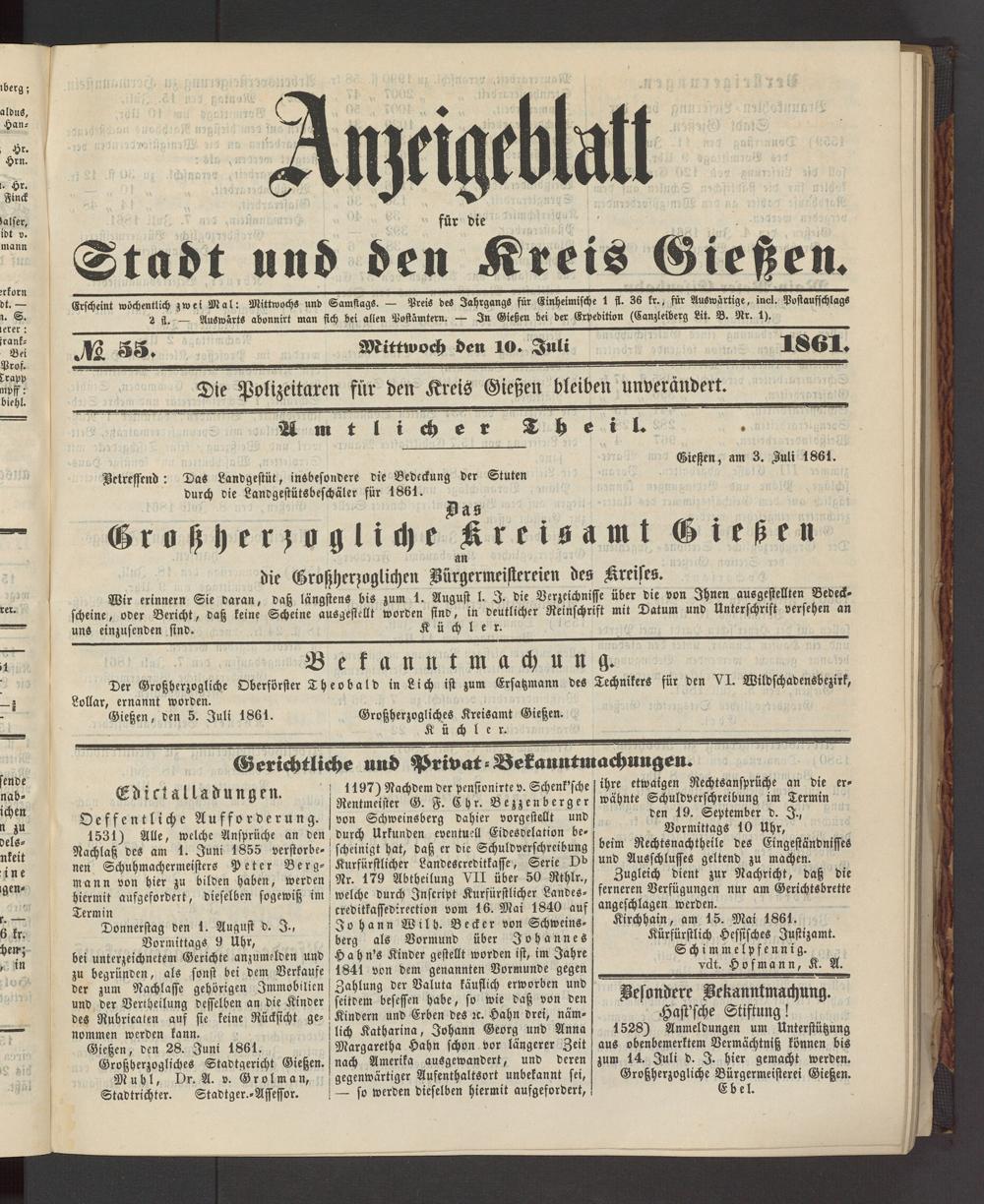 Anzeigeblatt für die Provinzialhauptstadt Gießen. 1840-1867