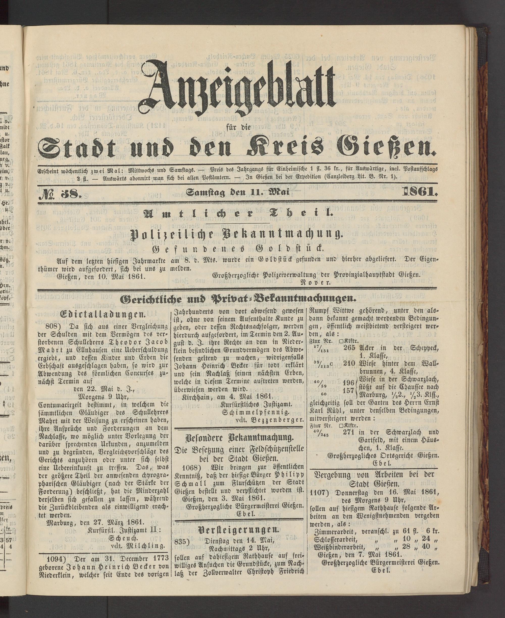 Anzeigeblatt für die Provinzialhauptstadt Gießen. 1840-1867