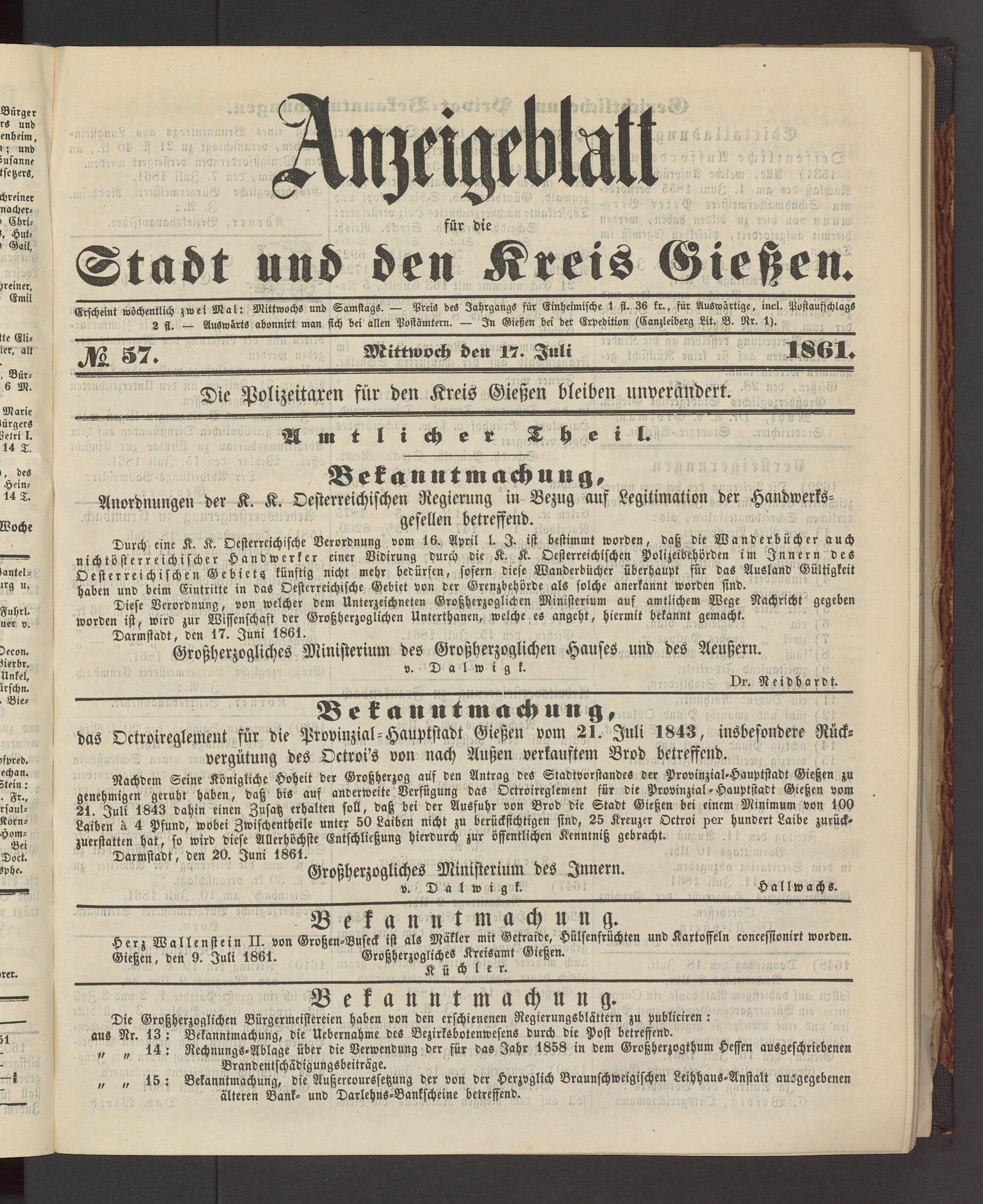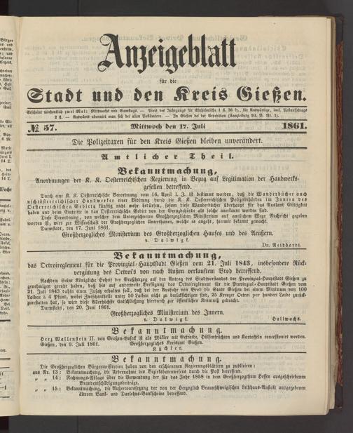 Anzeigeblatt für die Provinzialhauptstadt Gießen. 1840-1867