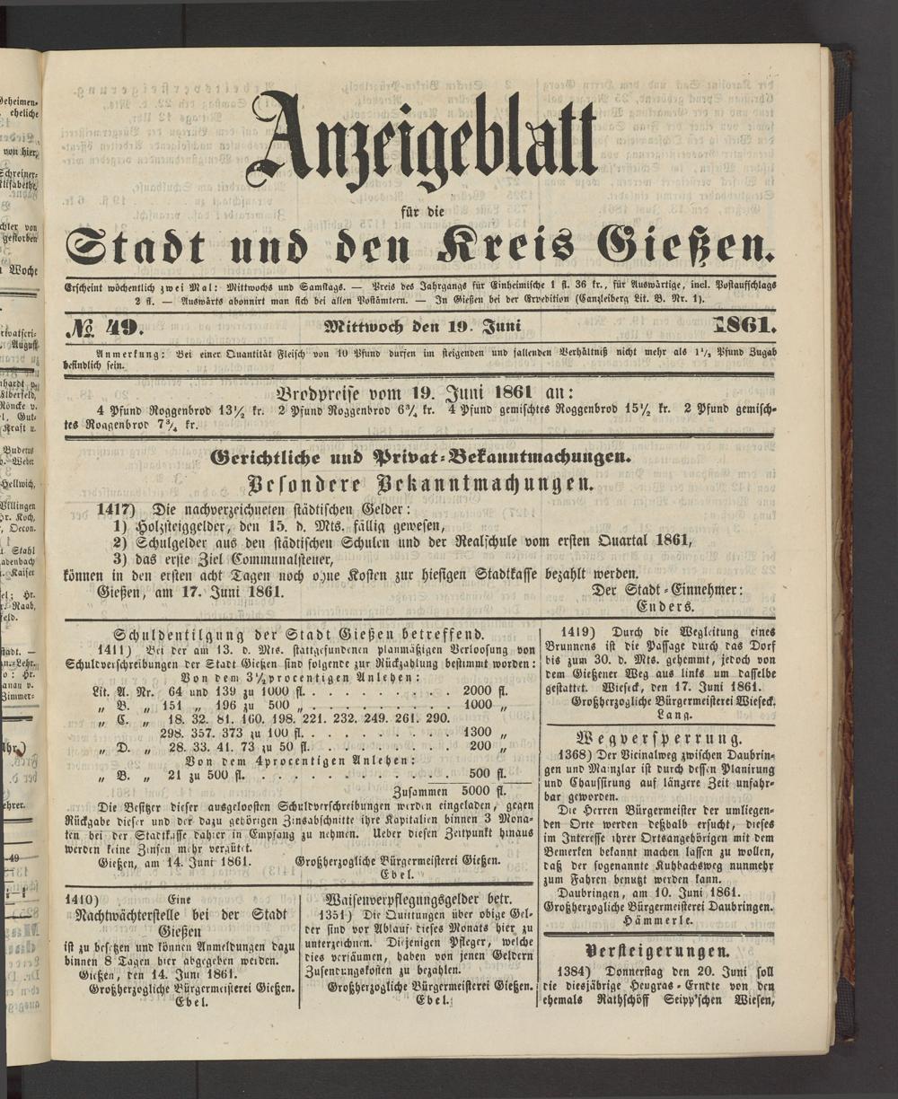 Anzeigeblatt für die Provinzialhauptstadt Gießen. 1840-1867