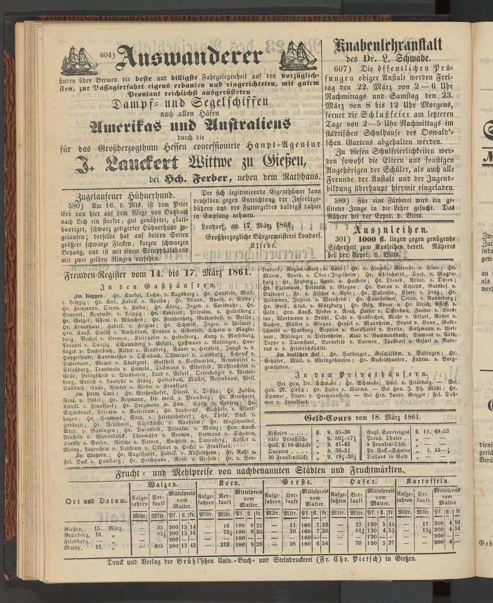 Anzeigeblatt für die Provinzialhauptstadt Gießen. 1840-1867