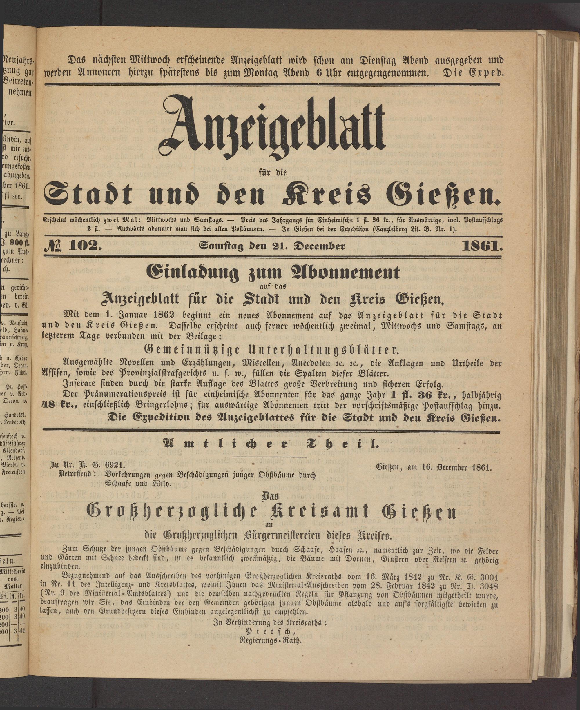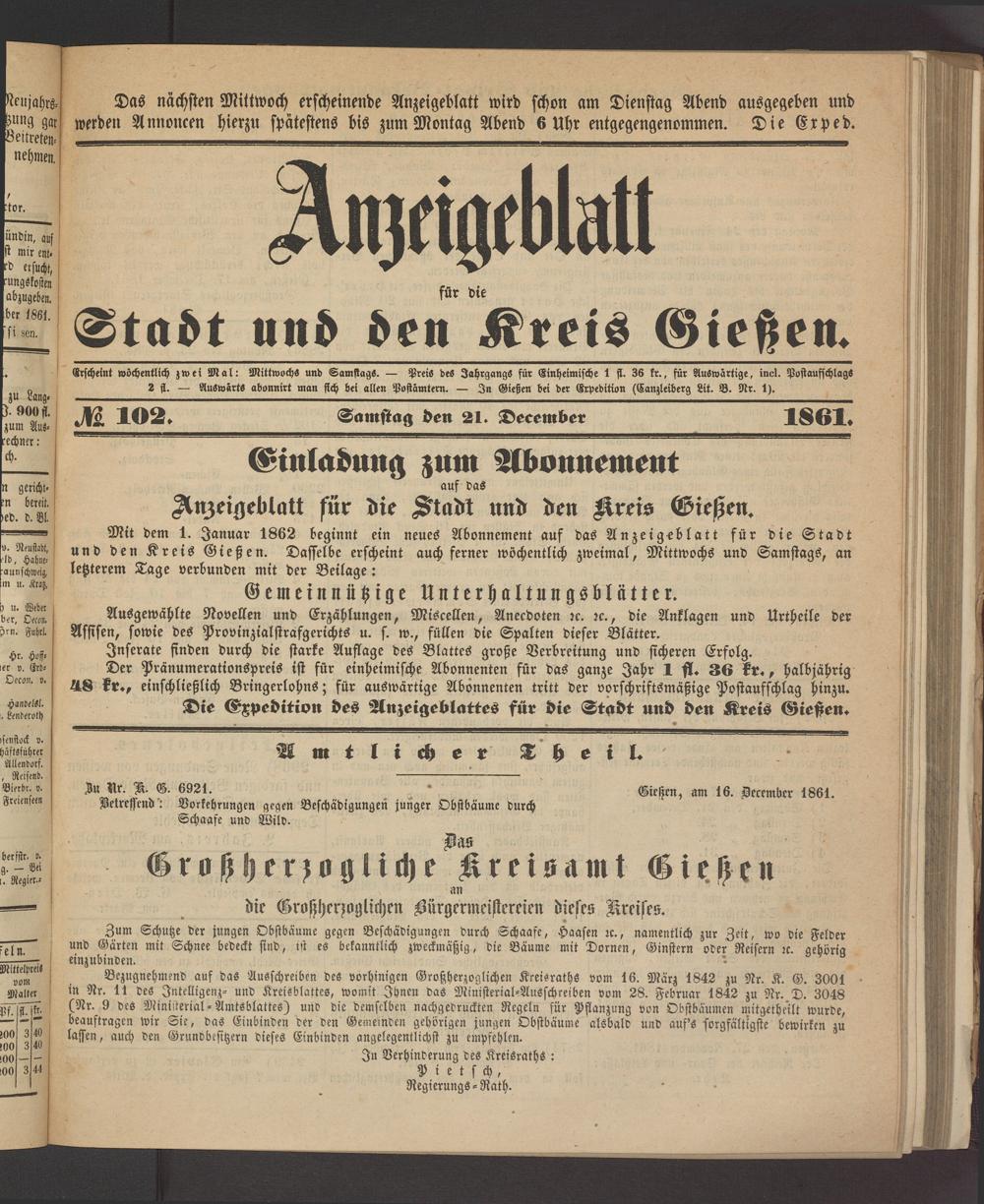 Anzeigeblatt für die Provinzialhauptstadt Gießen. 1840-1867